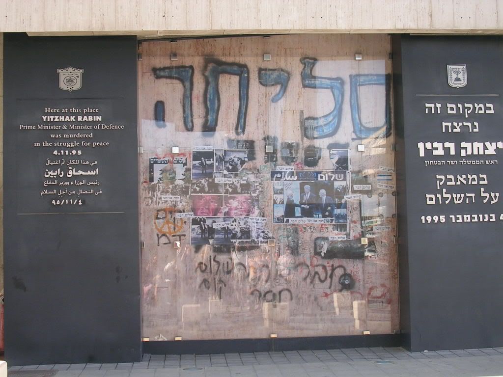 Another memorial at Rabin Square. The Hebrew word at the top says "S'lichah", literally "forgiveness" (I think).